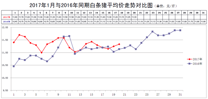 2017年1月20日,新发地市场白条猪的批发平均价是11.33元/斤,比2016年1月13日的11.1元/斤上涨2.07%;比2016年12月20日的10.88元/斤上涨4.14%;比2016年1月20日的11.13元/斤上涨1.80%。周环比小幅上涨;月环比小幅上涨;年同比小幅上涨。上周末,年同比持平,本周同比由持平转变为上涨。