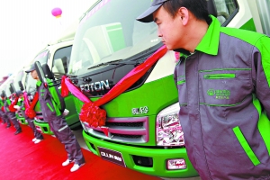 11月9日上午,50辆福田奥铃牌厢式货车身披红花,在新发地农产品批发市场集结。由它们组建的本市首批鲜活农产品绿色车队,今后每天都从这里往返城区内的大小菜站和超市。未来半年内,这支车队将扩编至1000辆。另据北京市交通委透露,本市18家单位的631辆老旧货车也将陆续换车,并加入绿色车队。